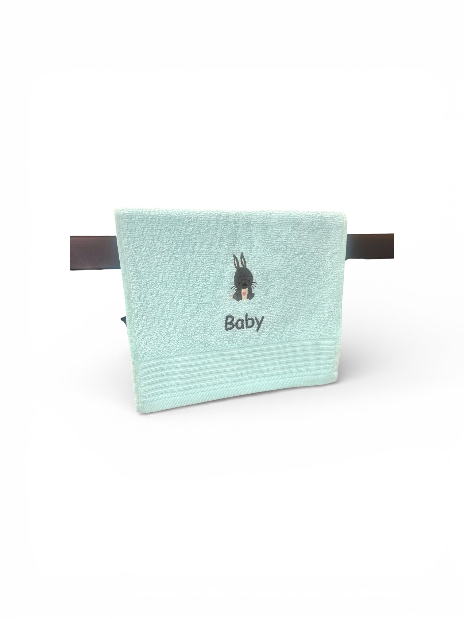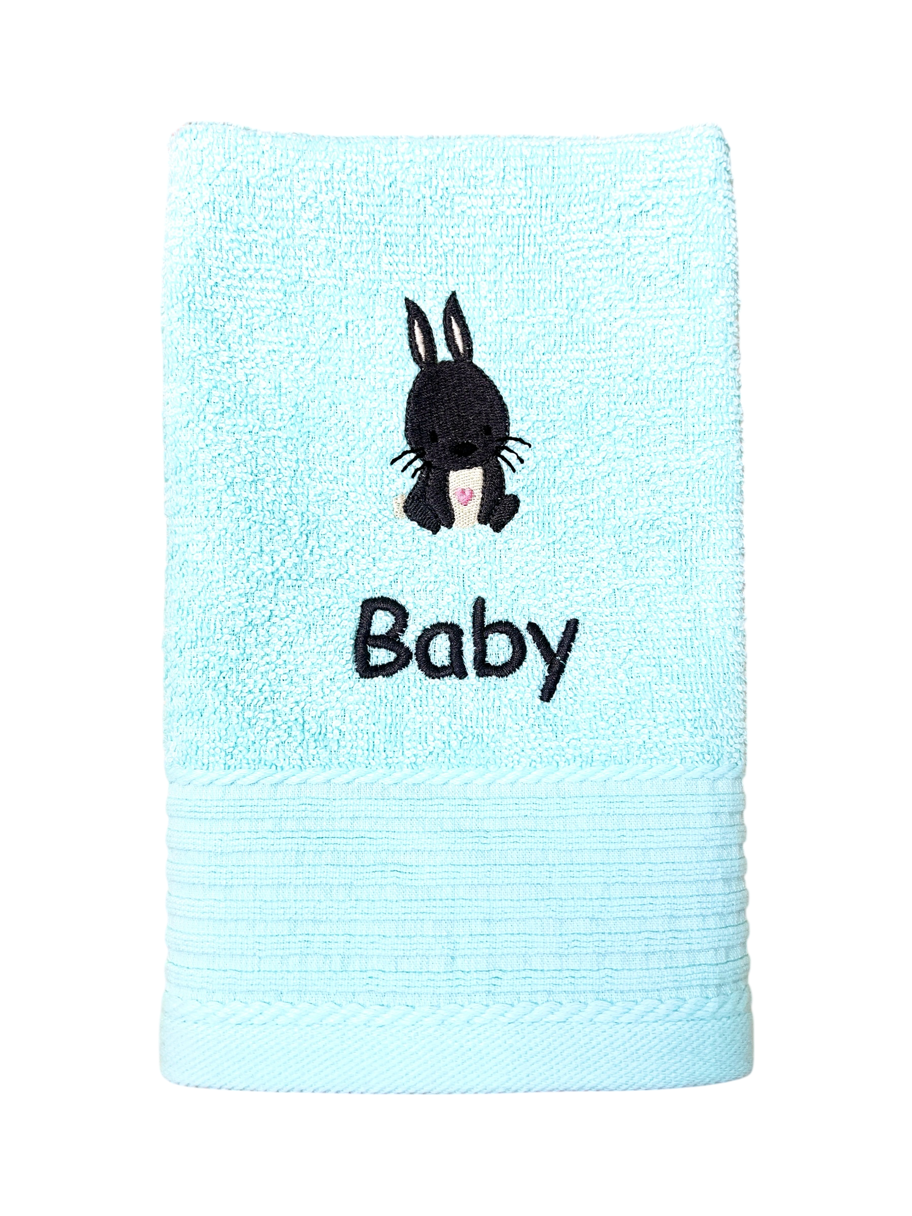Dieses flauschig weiche Handtuch in 30x50 cm besticken wir mit einem süßen Hasen und einem gewünschten Namen.