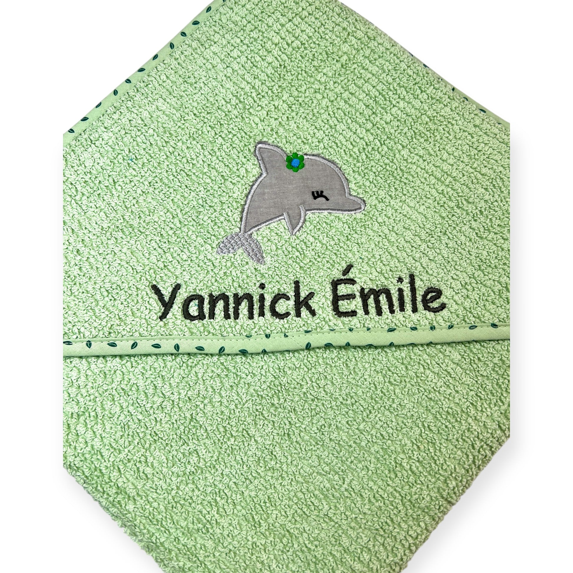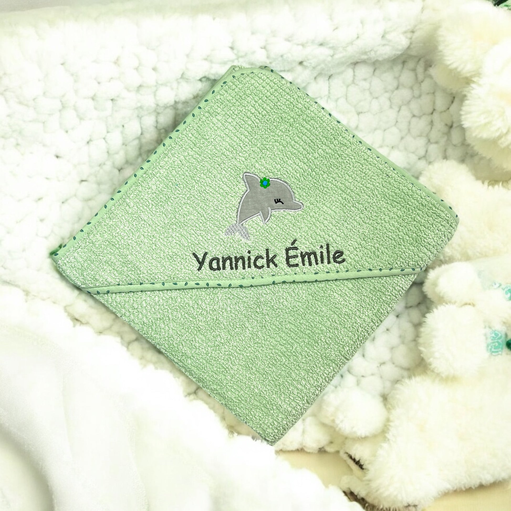 Kapuzenhandtuch mit Delfin und Name bestickt, Biobaumwolle, 100x100 cm, verschiedene Farben