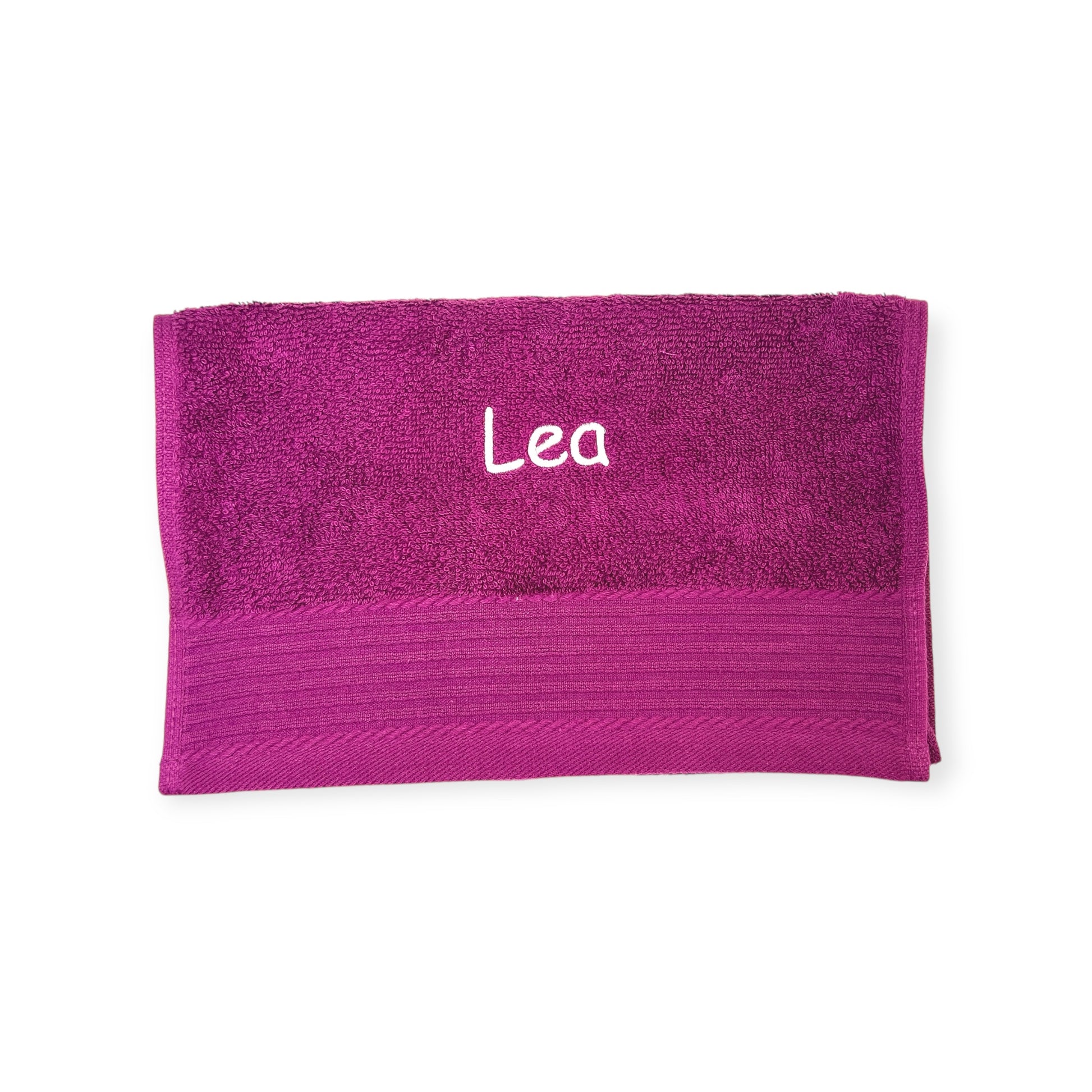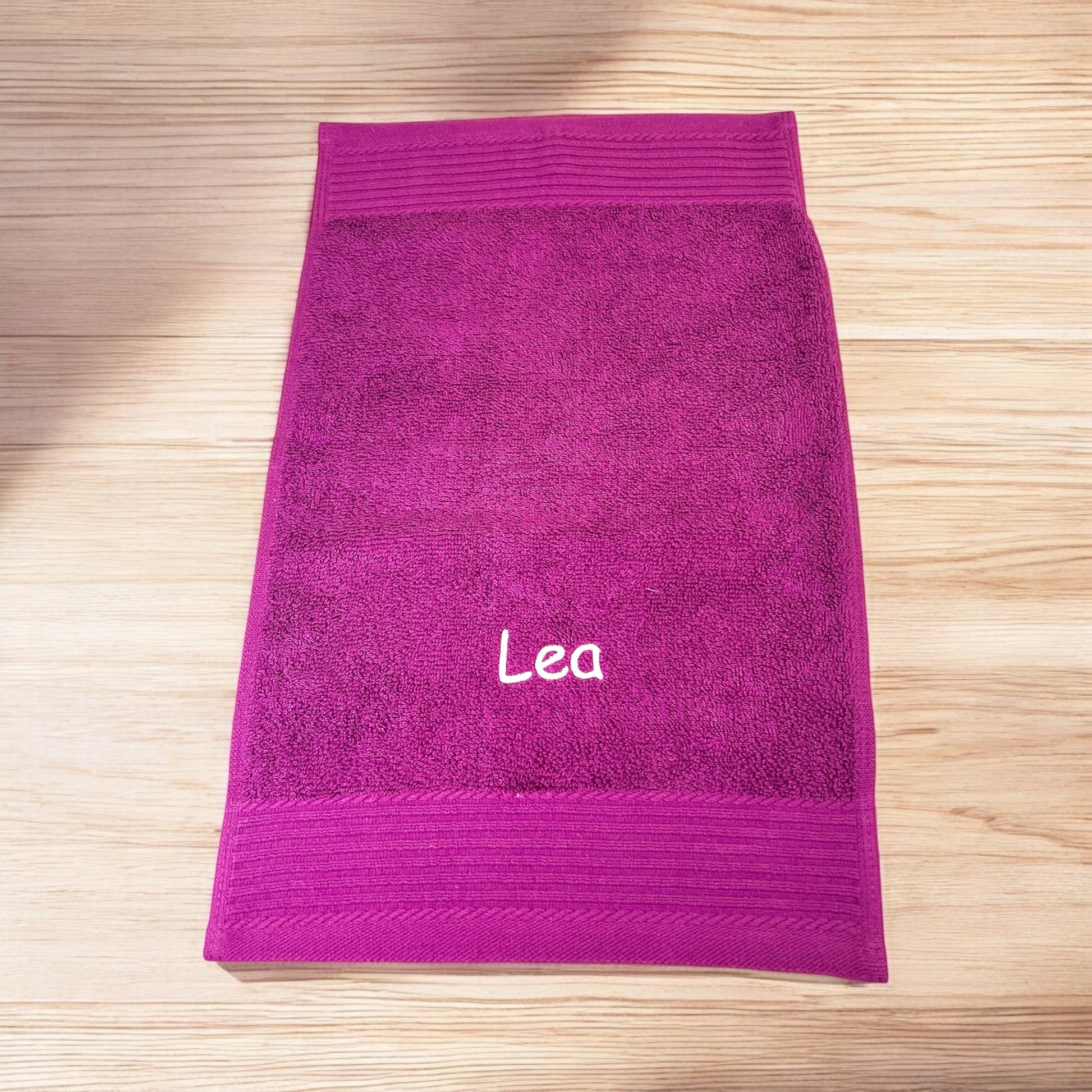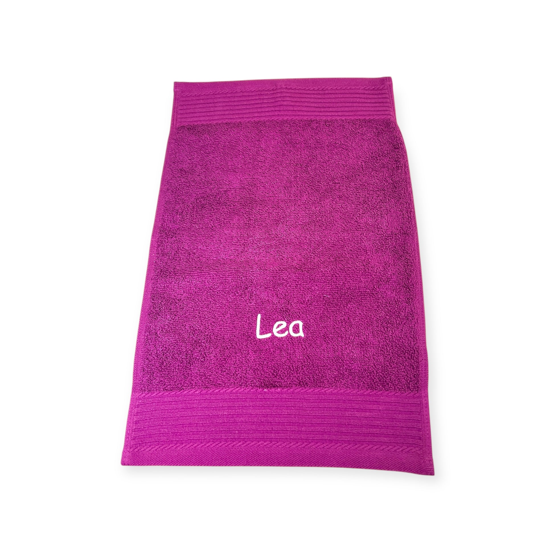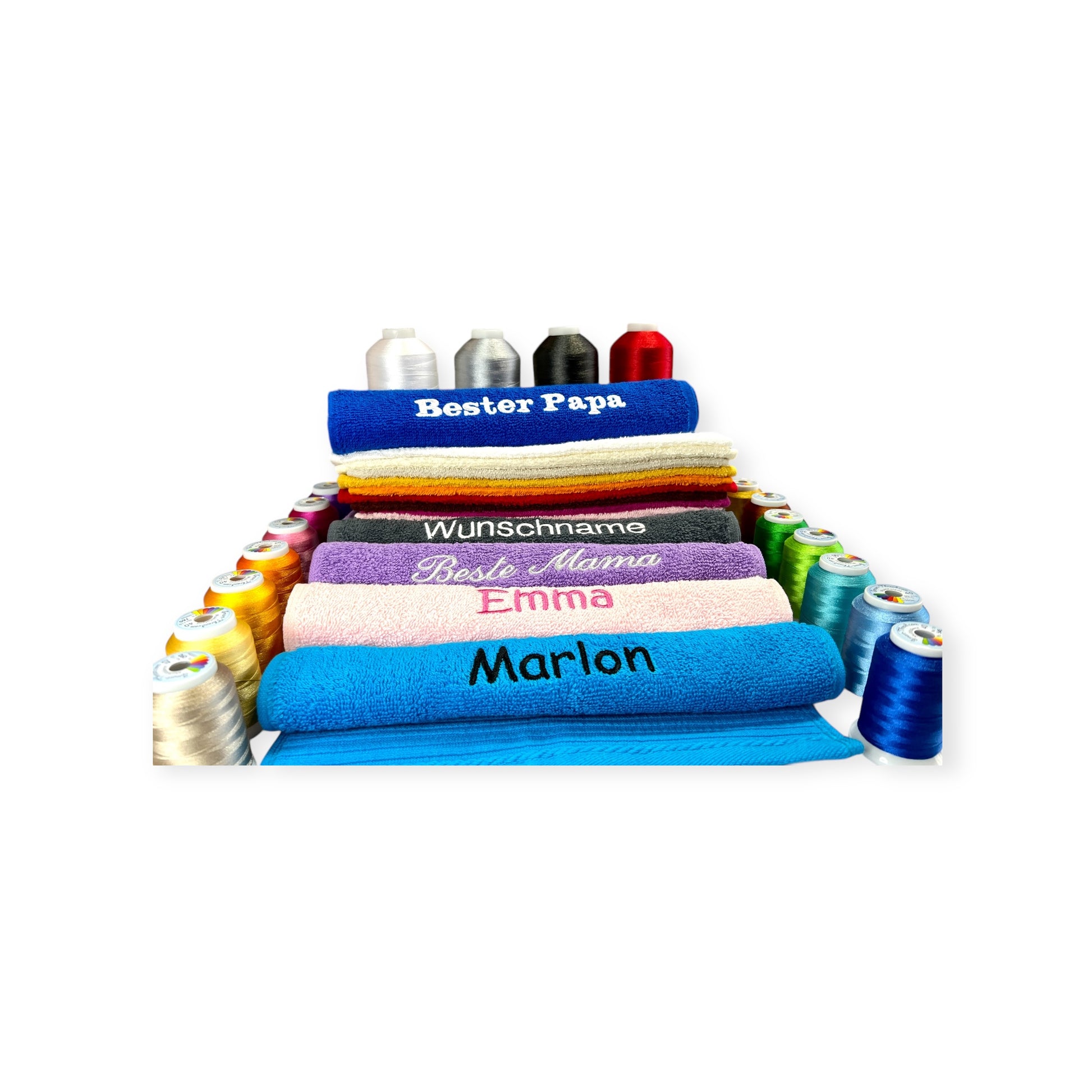 Ohne diese Angaben sticken wir es in der Schriftart "Kirsten" und in einer Farbe passend zum Handtuch.