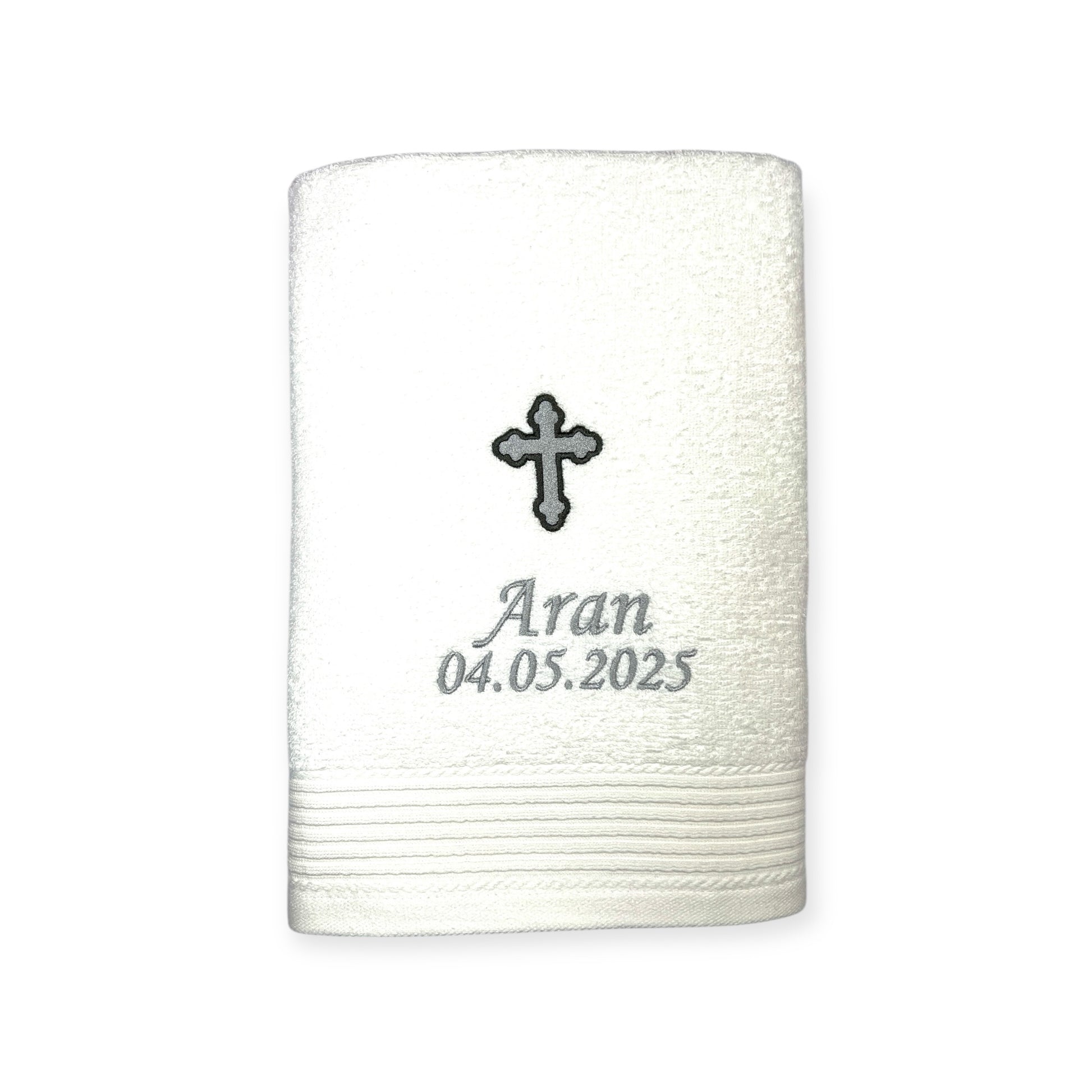 Handtuch mit Kreuz, Name und Datum bestickt