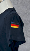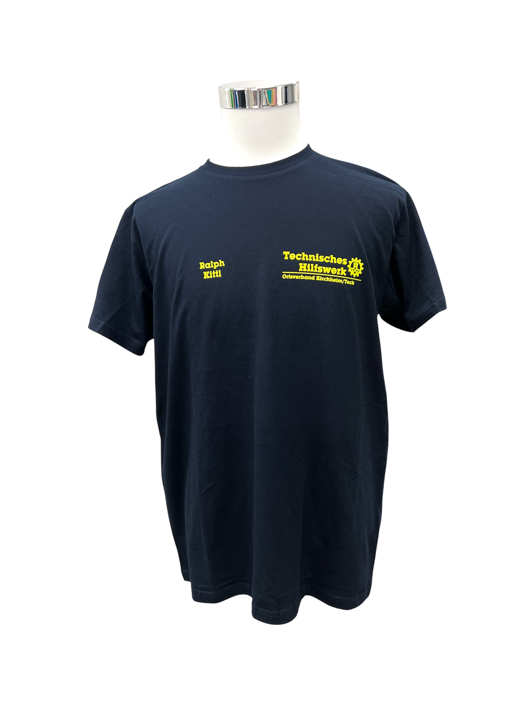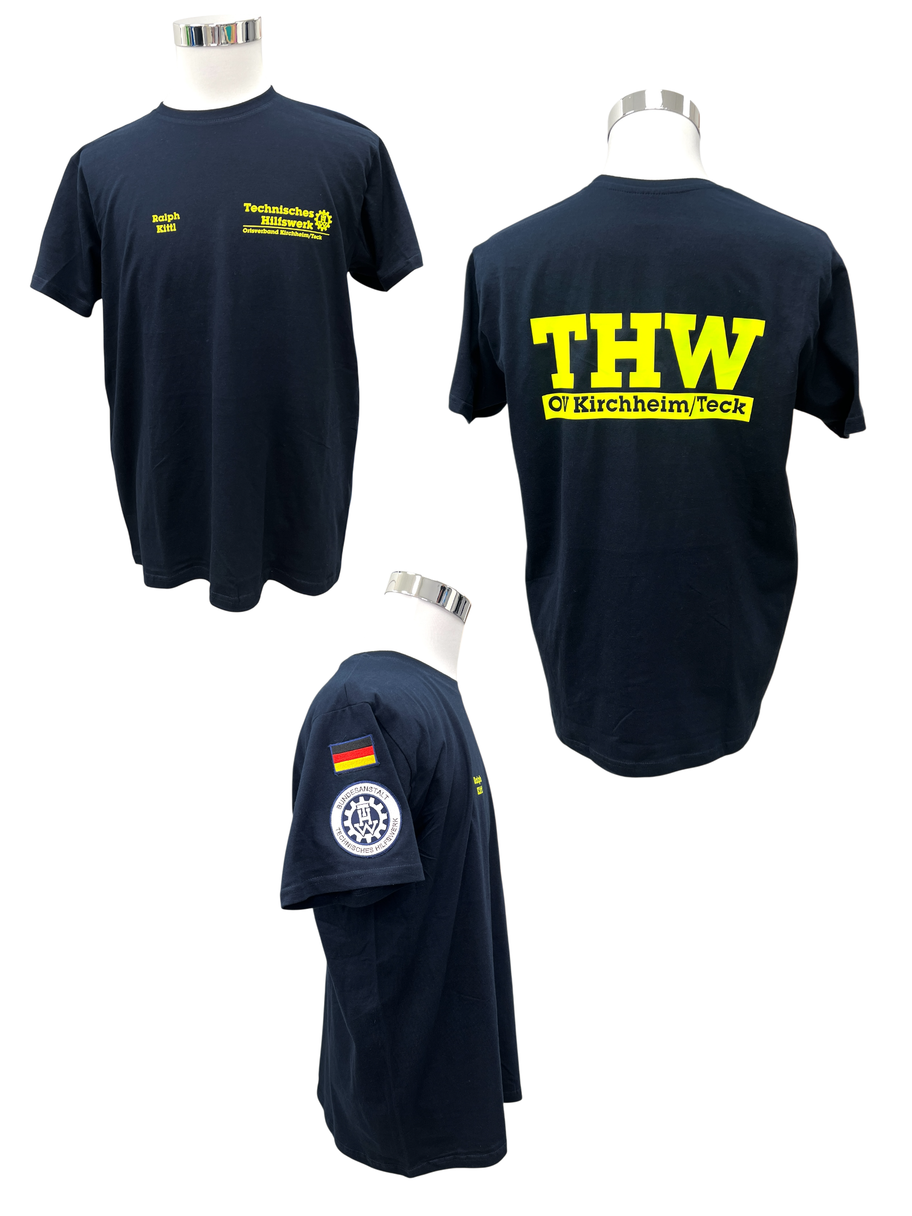 T-Shirt mit THW Druck auf Rücken und Brust links in Neongelb und Flaggen auf den Ärmeln. Auf Wunsch mit Ortsverband auf dem Rücken und der Brust. Ebenfalls auf Wunsch auch mit gestickten THW-Patches bilingual links und rechts auf den Ärmeln.