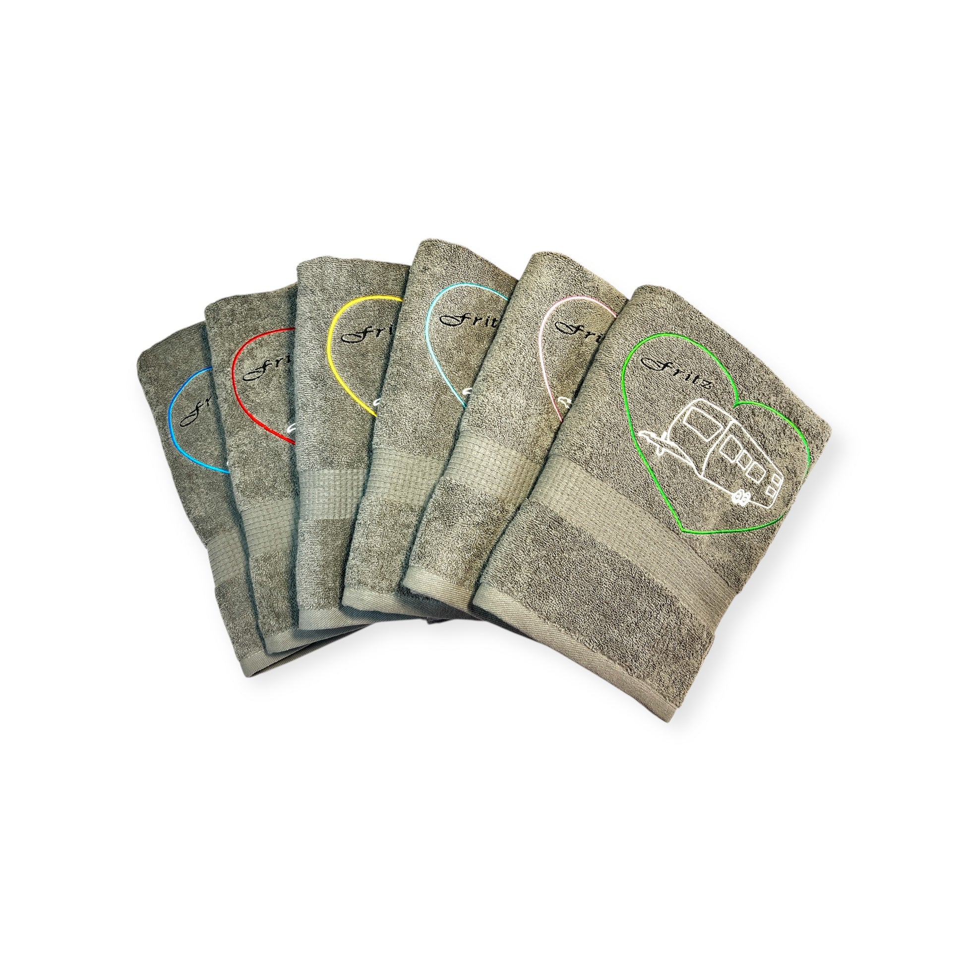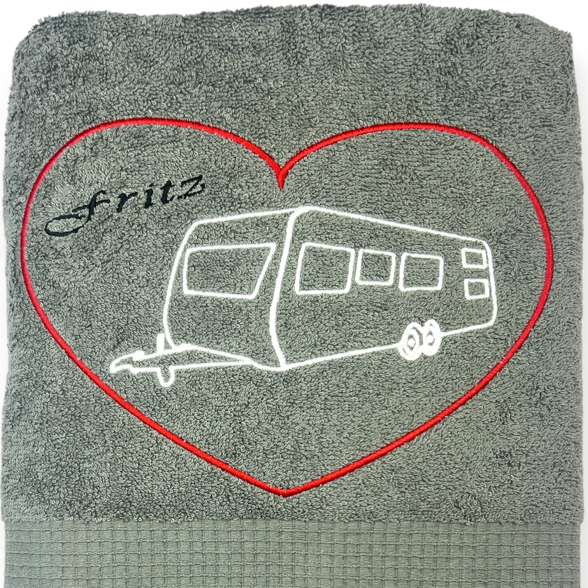 Handtuch mit Wohnwagen, Herz und Name bestickt Dieses flauschig weiche Duschhandtuch in farbenfrohen Farben ist in den Größen 30x50, 50x100, 70x140 oder 80x200 cm erhältlich.